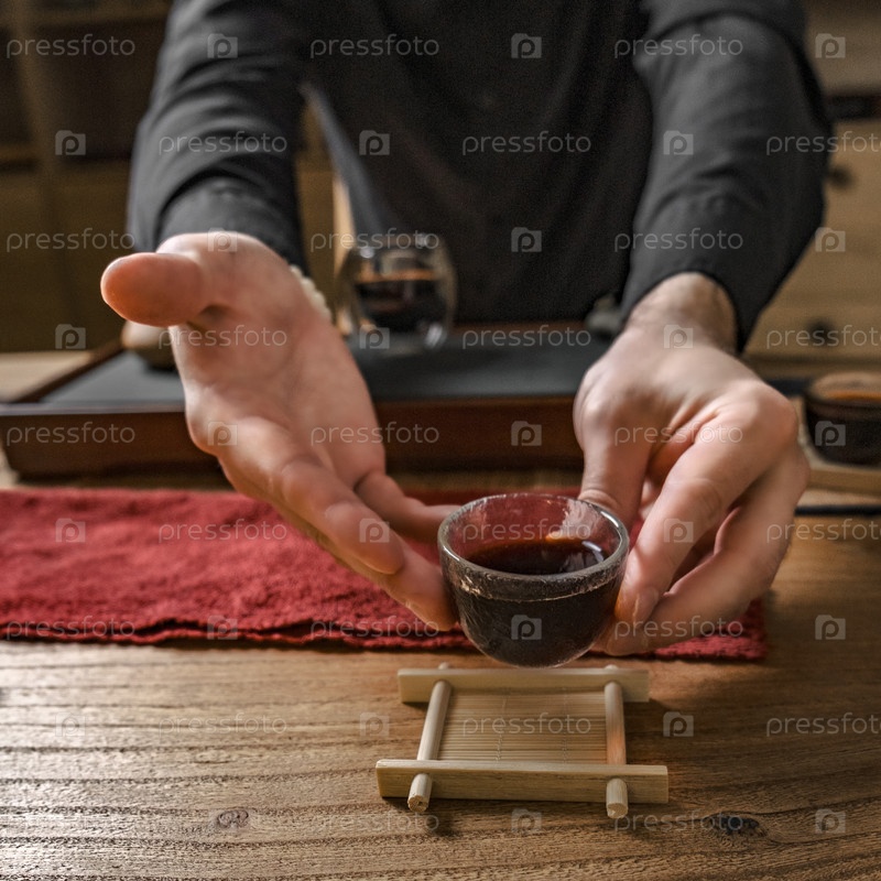 Мирная и безмятежная чайная церемония демонстрирует красиво темный напиток, подаваемый в элегантной стеклянной чашке