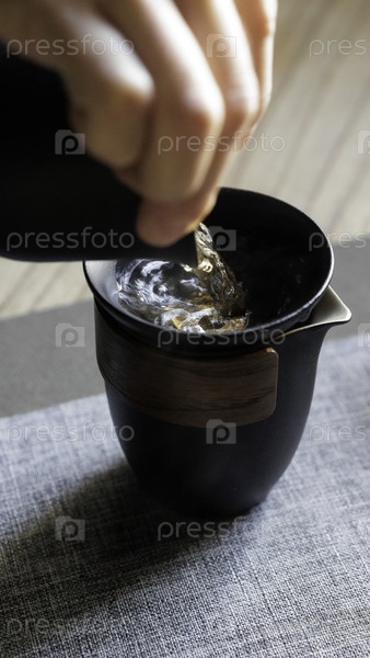 Элегантное и изящное искусство наливания пресной воды в стильную черную чашку