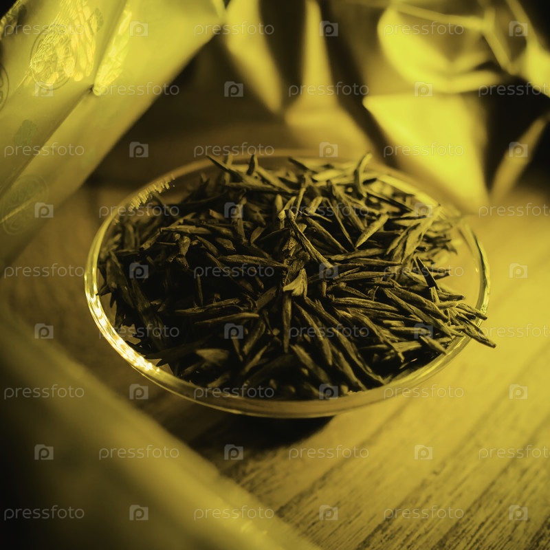 Нежные и свежие зеленые чайные листья красиво представлены в декоративной миске