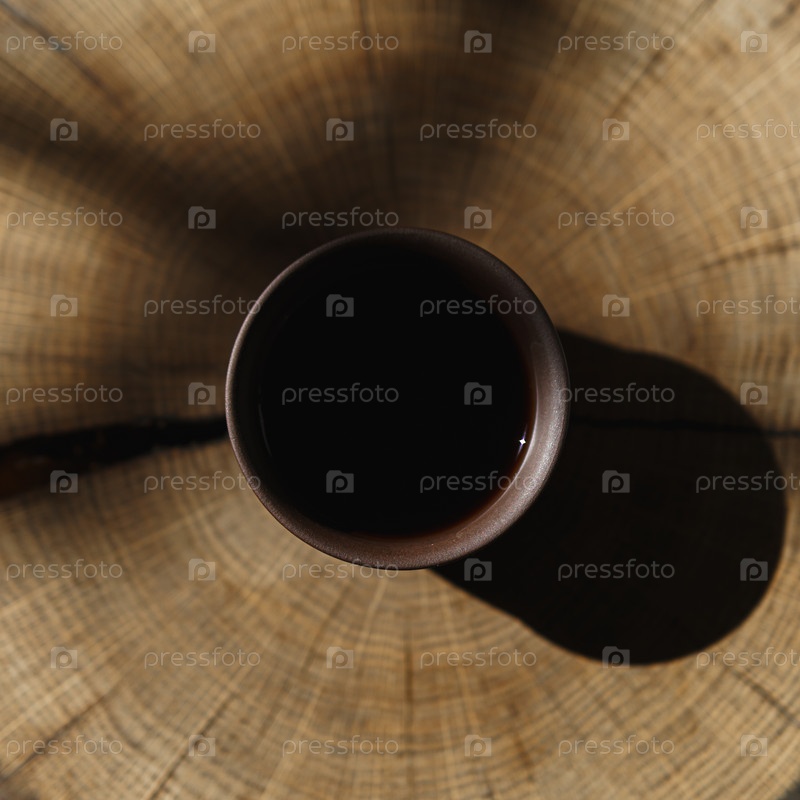 Вид с воздуха показывает чашку, наполненную темной жидкостью и помещенную на деревянный стол