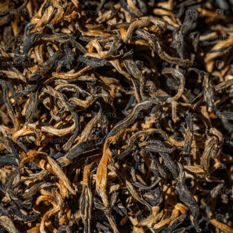 Это подробное изображение красиво высушенных листьев черного чая, которые демонстрируют свою уникальную богатую текстуру и цвет