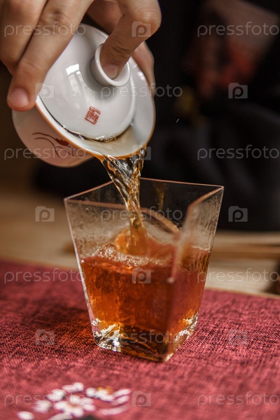 Умелая рука грациозно наливает ароматический чай в красиво прозрачный стакан, демонстрируя богатую сущность чайной культуры