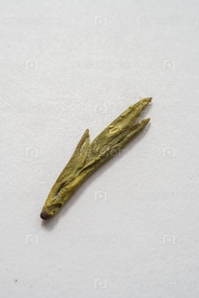 Близкий взгляд на один сушеный лист зеленого чая, который блестяще демонстрирует свою уникальную и сложную текстуру