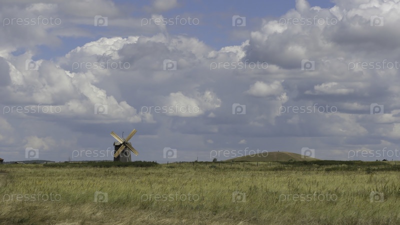 Летний пейзаж с травяным полем, голубым небом и ветряной мельницей на расстоянии. зеленый травянистый ландшафт с фантастическими облаками на заднем плане. великолепный летний ландшафт