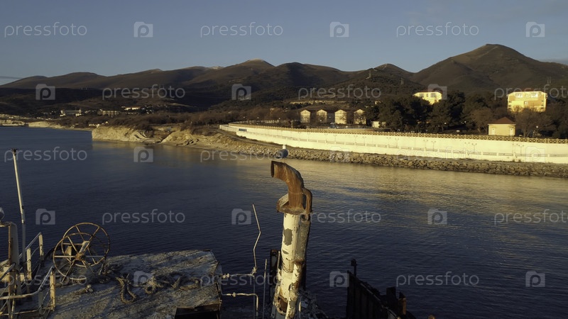 Идея старой и разрушенной бочки корабля и чайки, сидящей на ржавой трубе на закате солнца