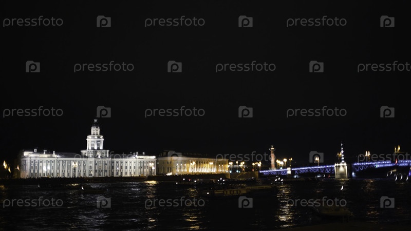 Многолюдная река на фоне древней архитектуры и моста ночью.Пойдите вперед.Многие лодки плавают по ночной реке города со старой светящейся архитектурой.Ночная река города