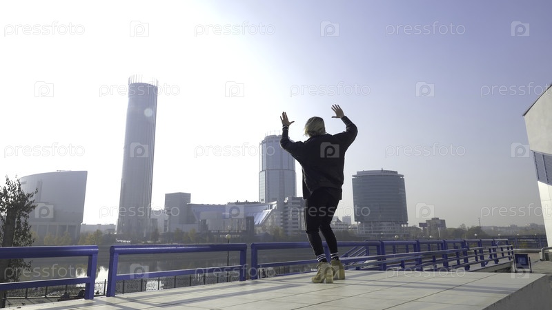 Молодая женщина танцует перед городом. Уличная танцовщица перед городом. Танцующая хипстерская девушка на улице