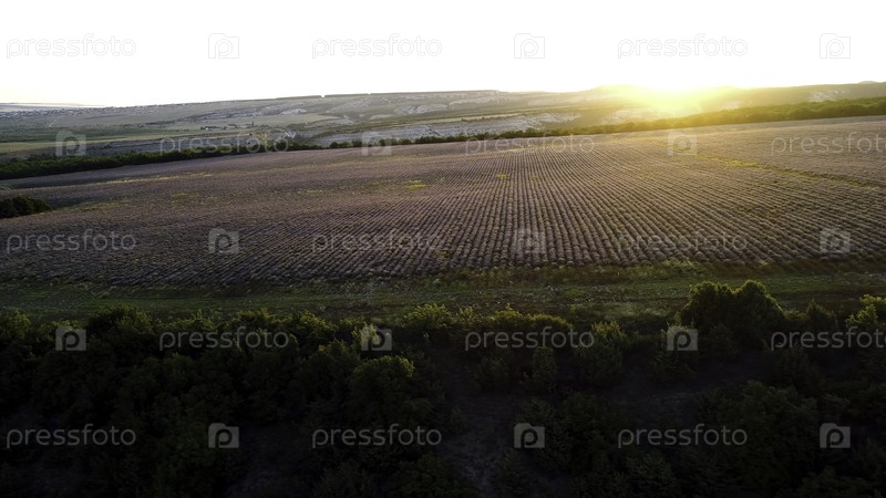 Вид на красивый пейзаж с лавандовым полем против солнца. Стреляйте. Фиолетовое поле цветов лаванды освещено лучами рассветного солнца
