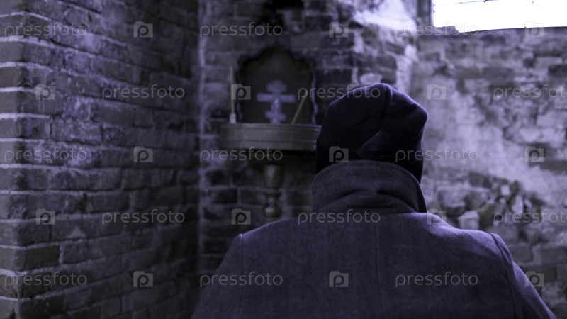 Человек в инвалидной коляске в разрушенной церкви. Кадры. Взгляд на человека в заброшенной церкви. Понятие воспоминаний