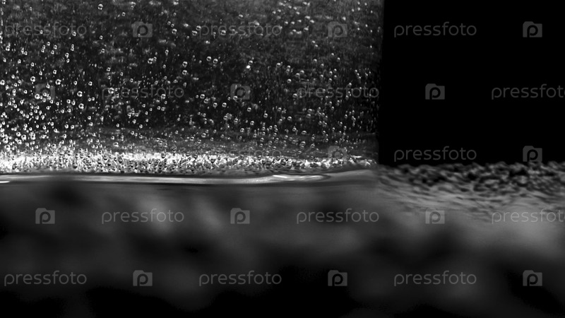 Сверху, газированная вода с пузырями в стакане. резервные кадры. Многие пузыри поднимаются со дна прозрачного бокала газированной воды на черном фоне