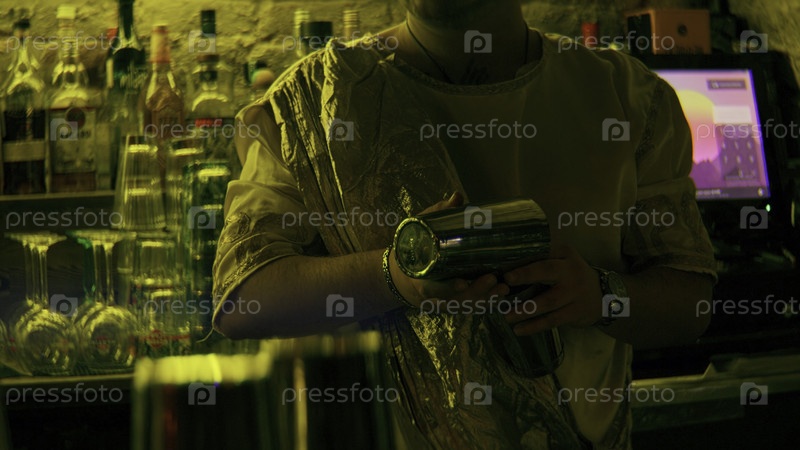 Профессиональный бармен держит очки, чтобы смешивать коктейли. резервная запись. профессиональный бармен смешивает коктейли среди наложенных бутылок алкоголя и неоновых фонарей