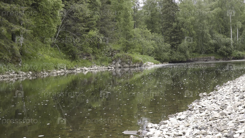 Красивый пейзаж, протекающий у спокойной реки среди зеленых лесов. Резервные кадры. Цветящая река медленно течет по лесу, отражая в воде зелёные деревья
