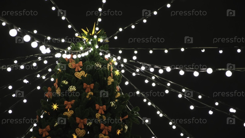 Вид снизу на красивую рождественскую елку с красочными декорациями и гирлянду белых огней, стоящую на площади