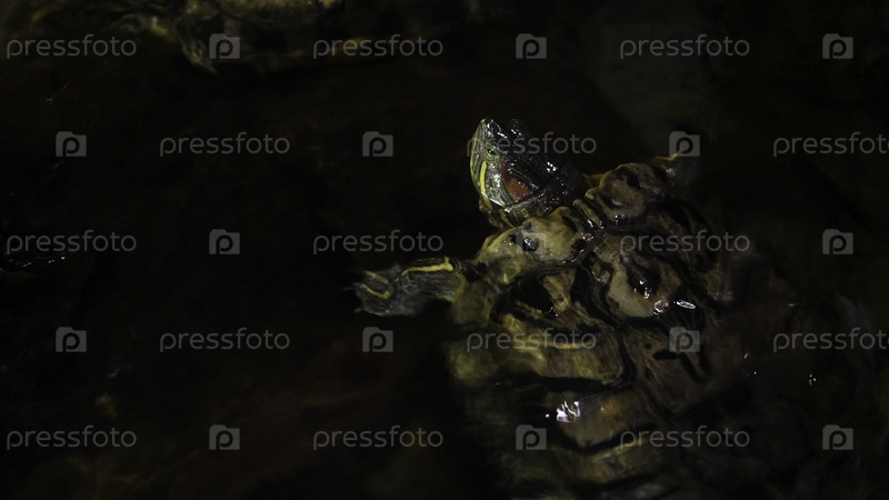 Черепаха в зоопарке. черепаха в воде в зоопарке. маленькая черепашка сидит в воде, ищет пищу