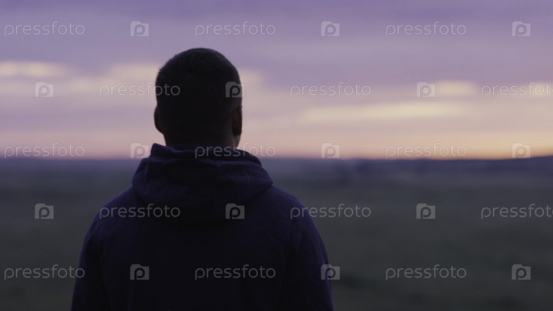 Молодой человек смотрит на закат в одиночестве, понятие свободы