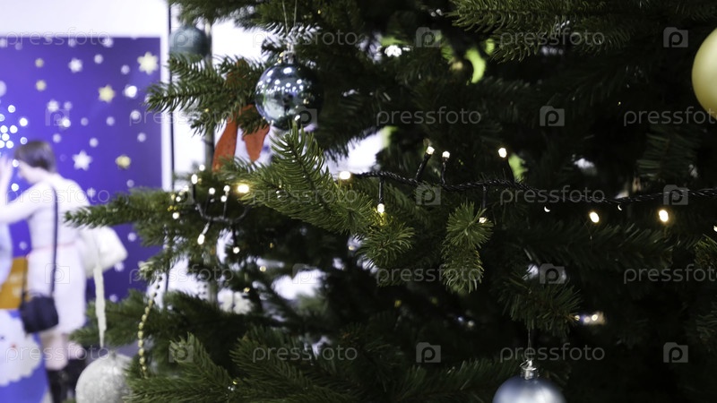 Уютный снежный новогодний интерьер. Рождественская или Новогодняя комната с одетой рождественской елкой с рождественскими шариками и свечами. Одетая рождественская елка в комнате