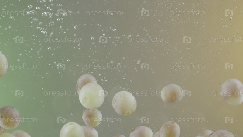 Виноград попадает в воду на изолированном фоне. Идите дальше. Зеленые винограды падают в воду на красочном фоне. Освежающие винограда в воде с пузырями