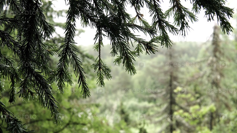 Зеленые ветви елей висят с росой в лесу. резервные кадры. Нежные капли росы зависают на иглах зеленого елей, раскачивающихся в лесу в пасмурную погоду