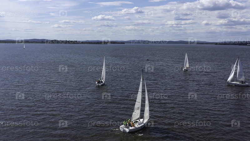 Некоторые красивые белые яхты плывут по прекрасному пруду.В воздухе вид небольших парусных лодок на реке во время соревнований в голубом облачном небе