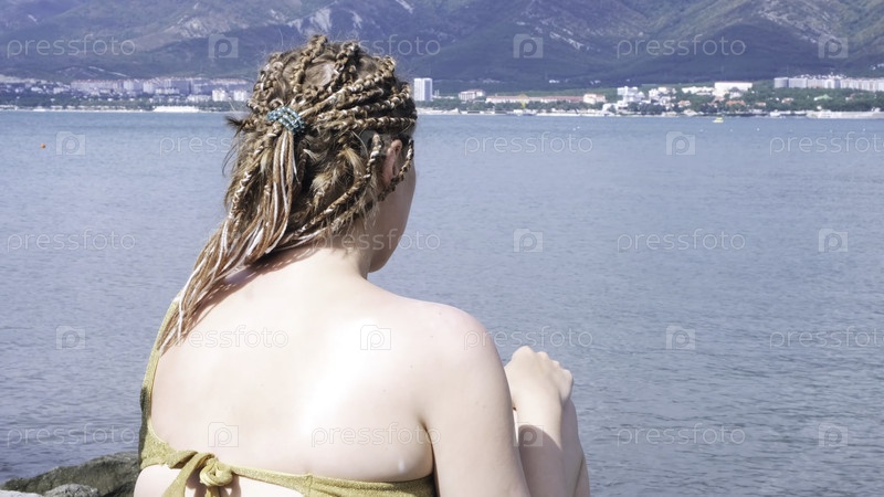 Девушка с африканскими сковородами на синем фоне морского пляжа