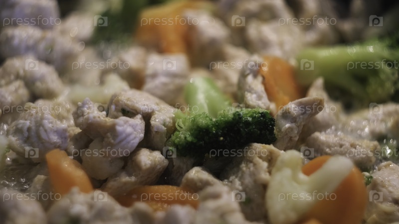 Перемешайте жареную курицу с овощами, здоровой пищей и диетой. Концепция. Покройте жареные зеленые брокколи, морковь и курицу кипящим подсолнечным маслом