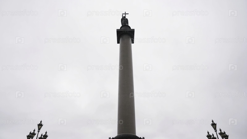 Александровская колонна посреди Дворцовой площади в Санкт-Петербурге, Россия Нижний вид гигантской гранитной колонны на фоне облачного неба