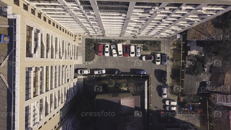 Вид сверху на крышу многоэтажного здания с припаркованными автомобилями во дворе.Горизонтальный вид многоэтажного здания со внутренним дворцом