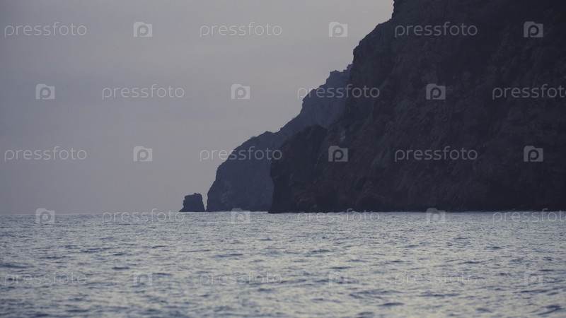 Вечерний красивый пейзаж с скалами, летающей чайкой и небольшими морскими волнами. Снимайте. Природный фон захода солнца над волнами поверхности моря и гор