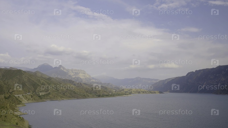 Прекрасное озеро в горах. Идите дальше. Вид на живописное озеро на фоне гор в пасмурную погоду. Спокойное озеро в горах против облачного неба