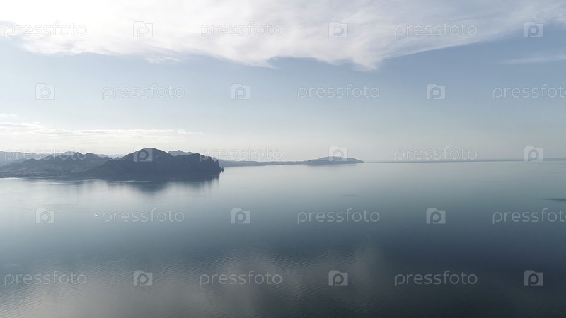 Зеркальная вода отражает голубое небо с горным горизонтом. Снимай. Живописный пейзаж с отражением синего неба на тихой поверхности моря. Соединяющееся море и небо разделены горным горизонтом