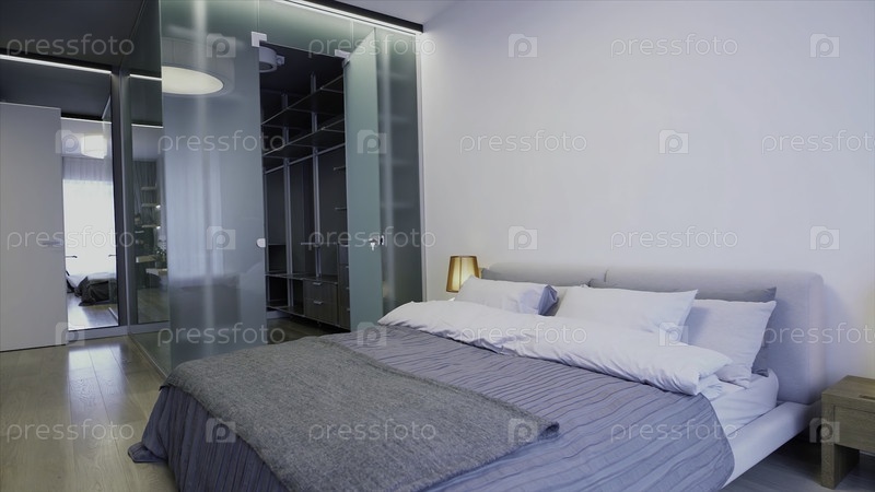 Новый номер отеля с спальней, наполненной солнечным светом. видео. красивый интерьер с двуспальной кроватью, лампой, ночным столом и раздевалкой
