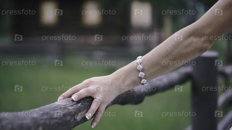 Руки невесты на красивом белом свадебном платье. клип. молодоженка на открытом воздухе возле деревянного забора