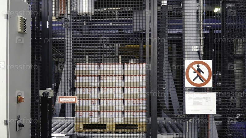 Москва, Россия - май 2017 года: Упаковочная машина для клиента.Клип.Упаковка коробки с лентой на фабрике