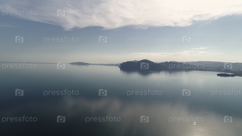 зеркальная поверхность моря с горным побережьем. вода отражает голубое небо на рассвете на фоне горного побережья. живописный морской пейзаж со зеркальной водой