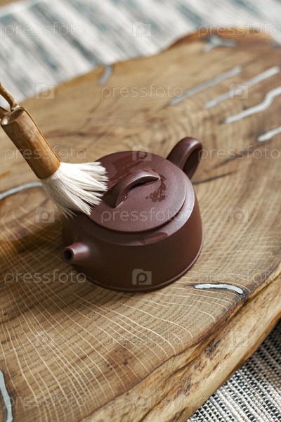 Традиционный чайник опирается на деревянную доску, изящно сопровождаемую кистью