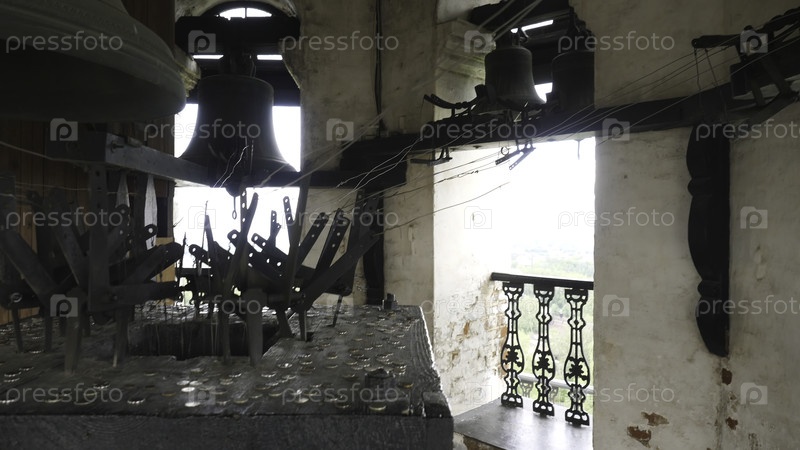 Комплекс железных древних колоколов внутри башни собора, концепция архитектуры, религии и веры