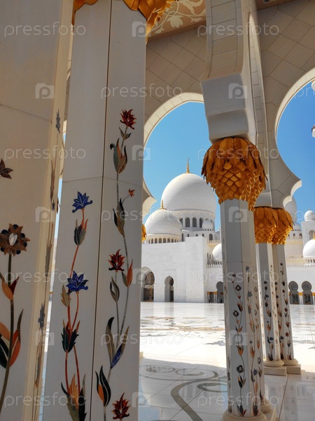 Абу-Даби, ОАЭ - 14 октября 2024 года: Украшенные колонны цветочного узора детализируют мечеть Великого шейха Заида с величественными куполами на заднем плане