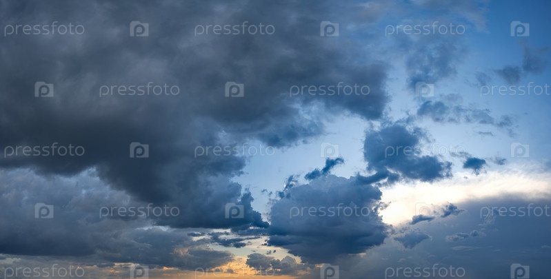 Панорамный вид на вечернее небо с закатывающимся солнцем и многоцветными облаками
