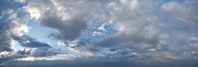Панорамный вид на вечернее небо с закатывающимся солнцем и многоцветными облаками