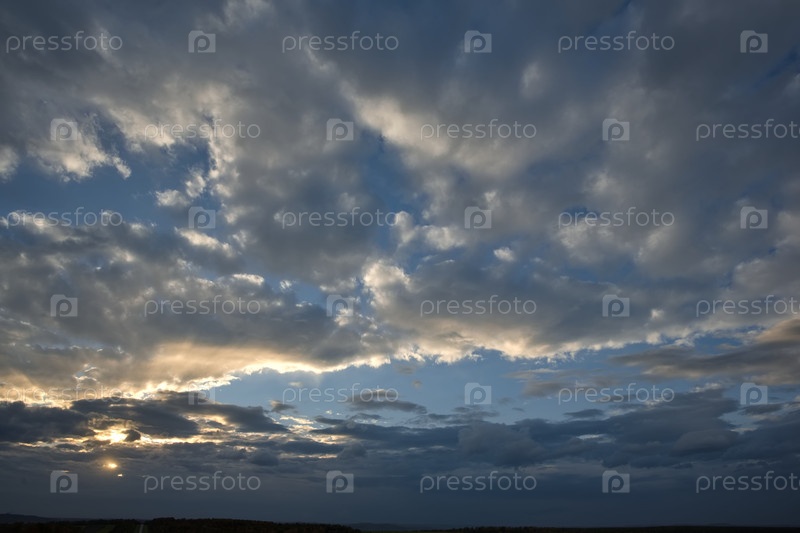 Панорамный вид на вечернее небо с закатывающимся солнцем и многоцветными облаками