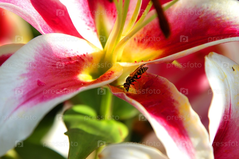 ОСА НА ЛЕПЕСТКАХ ЛИЛИИ ПЬЕТ ВОДУ. A WASP ON THE PETALS OF A LILY DRINKS WATER