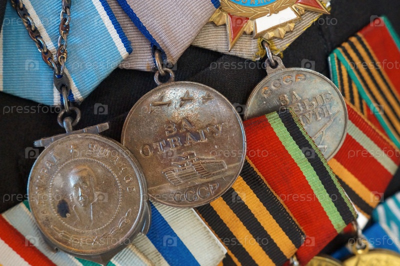 Близкий план орденов и медалей СССР во время Великой Отечественной войны: за мужество, военные заслуги и другие