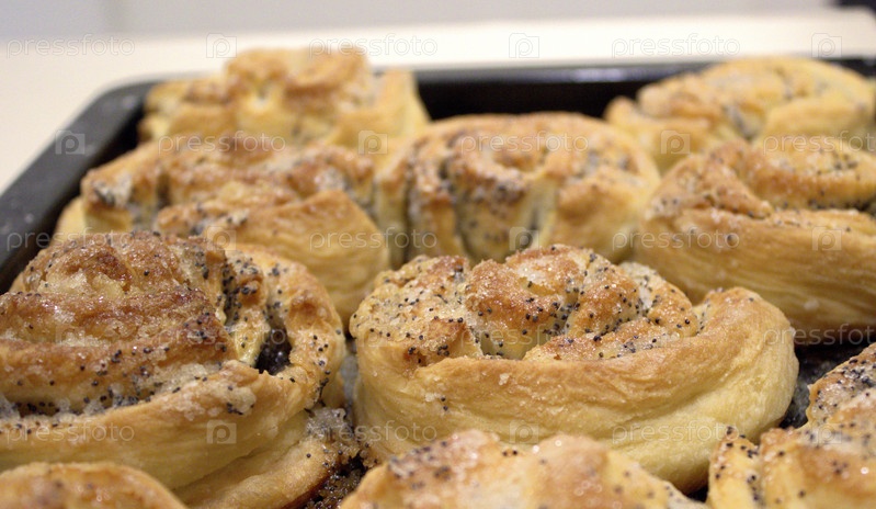 Свежевыпеченные маковые булочки на металлическом черном подносе