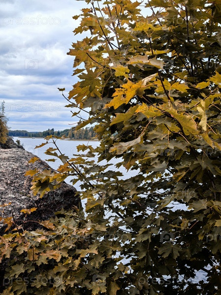 Осенние листья с видом на озеро и лес