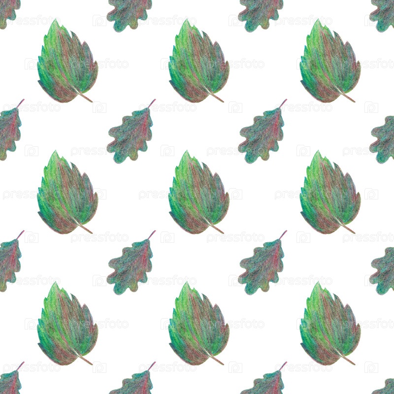 Бесшовный рисунок с листьями березы и дуба на белом фоне.Может использоваться для открыток, оберточек, скапбуков, обоев.Рисование цветными карандашами вручную