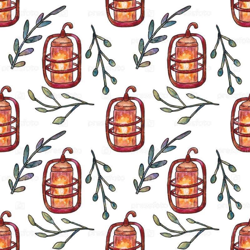 Бесшовный рисунок со фонарем и ветвями с листьями на белом фоне