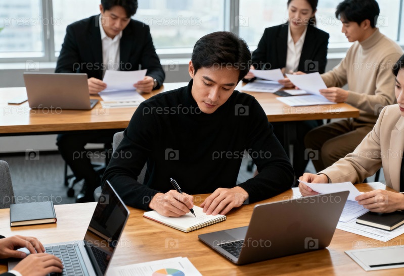 Деловая группа работает вместе в современном офисном конференц-зале с ноутбуками
