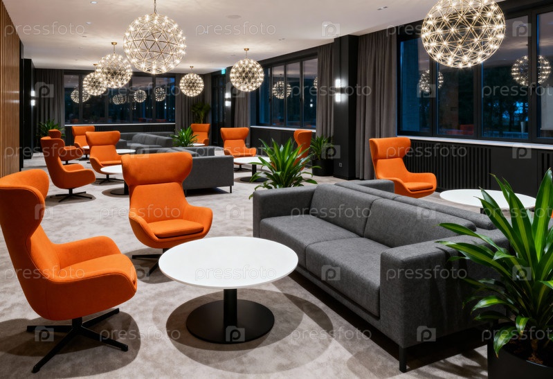 Современная гостиная с оранжевыми креслами, серыми диванами и сферическими люстрами