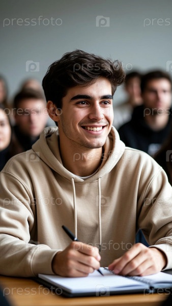 Студент сидит за столом на лекции в институте среди других студентов