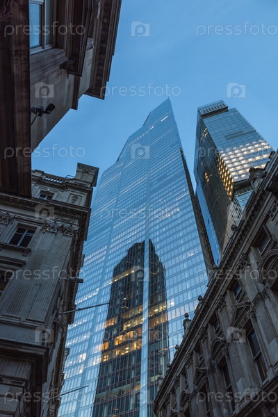 Современные стеклянные небоскребы возвышаются над историческими улицами финансового района в сумерках